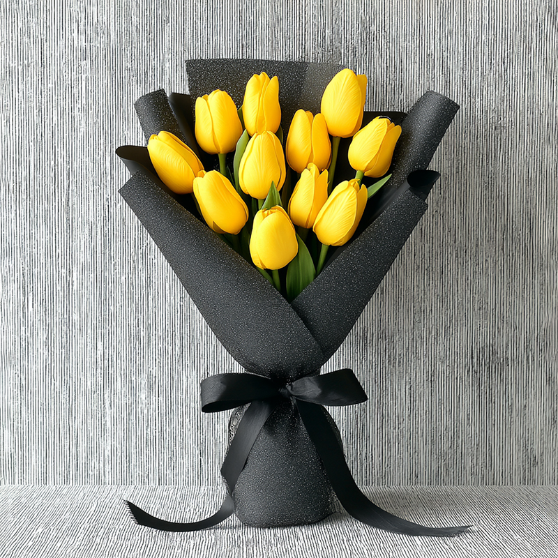 This bouquet of yellow tulips is like a bottle of sunshine spilled open. The vivid yellow blooms seem to hold the midsummer sun in their petals, each one glowing with radiant sweetness. The deep black wrapping is like a curtain of night, grounding the overflowing light. A black ribbon is tied into an elegant knot, softly saying, "Let a whole bright morning be gathered in this bouquet." One glance, and you fall into a warm yellow whirl— even the breeze carries a citrus-like freshness, telling a story bathed in brightness.